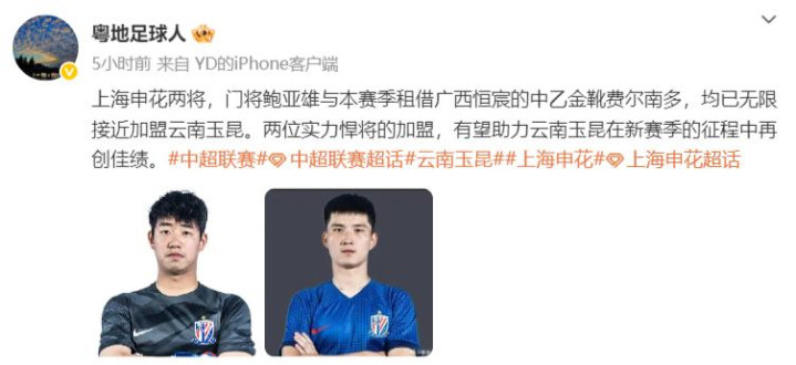 而且咫尺看来,云南玉昆的引援脚步并未罢手,据有名博主“粤地足球东谈主”流露,上海申花有两名球员无穷接近加盟云南玉昆,他们诀别是门将鲍亚雄和前锋费尔南多,值得细心的是,鲍亚雄本赛季因为伤病问题,被薛庆浩抢去了首发位置,而费尔南多本赛季则是被上海申花外租至中乙球队广西恒宸,该球员本赛季打进24球的同期,还荣获中乙金靴和中乙最好球员。