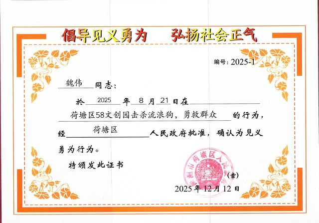株洲日报讯(全媒体记者/周圆)危急降临之际挺身而出,近日,记者从联系部门获悉,市民魏伟勇斗恶犬保护众人的果敢作为被肃肃证据为济弱扶倾。