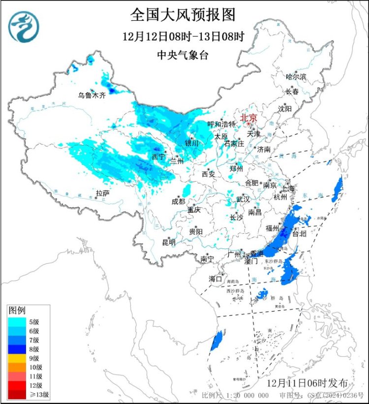 预测,12月11日08时至12日08时,新疆北疆东部和南疆盆地、西北地区中东部、内蒙古西部、华北西部、山东半岛、西藏中北部等地部分地区有5~7级、阵风8~9级的大风,其中,新疆山口地区阵风可达10~11级;渤海、渤海海峡、黄海大部海域、东海大部海域、台湾海峡、南海东北部和中东部海域将有7级、阵风8~9级的大风,其中渤海、黄海北部海域、台湾海峡部分海域风力可达8级、阵风9~10级。